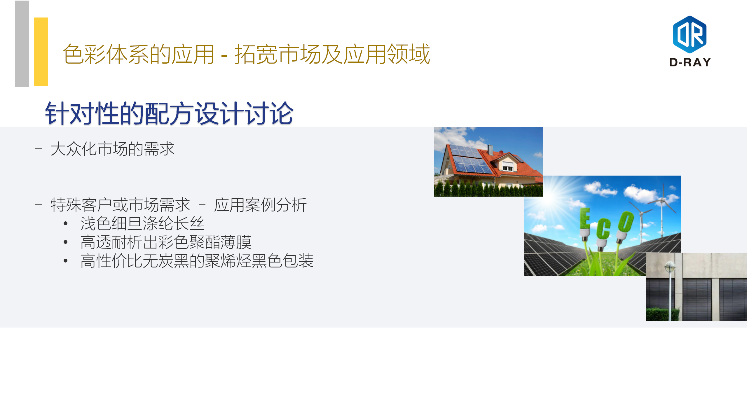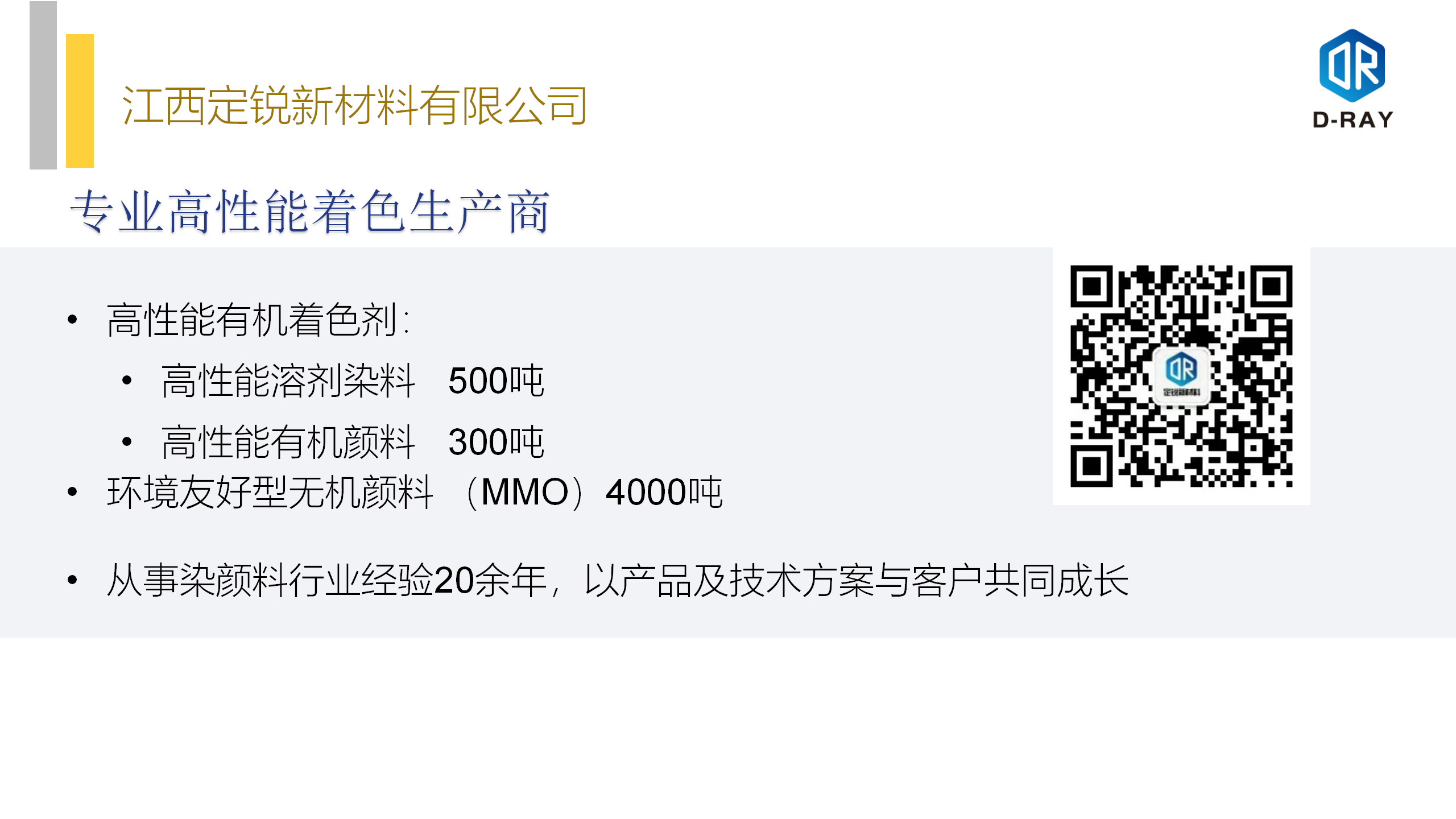 华东理工大学 高分子材料科学与工程专业,先后在科莱恩,巴斯夫和美利肯等企业从事色彩和材料技术及市场工作,从业20余年,现任定锐新材料市场总监,专注于塑料色彩应用及新型着色剂开发工作,在高温工程塑料,化纤及其他细分高要求塑料着色产品有较多理解。