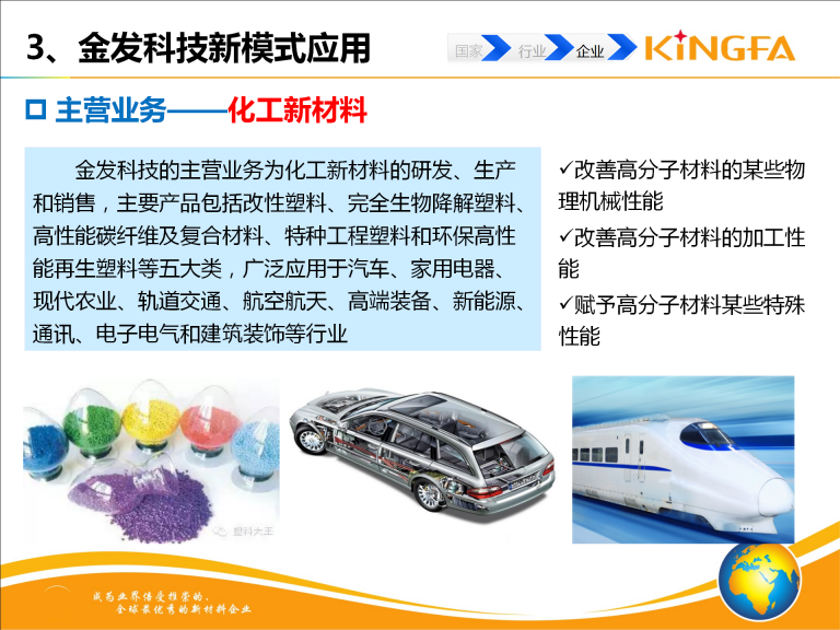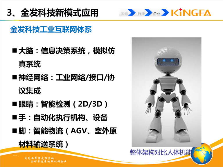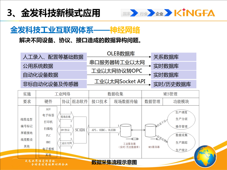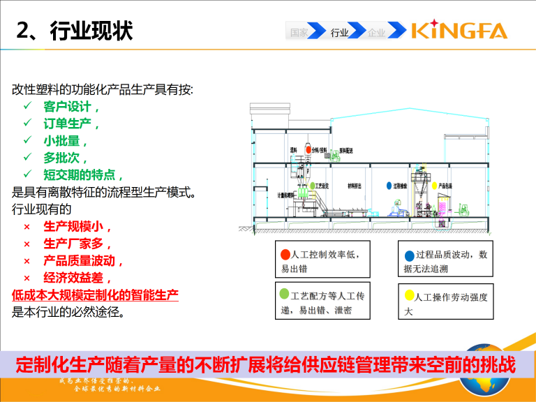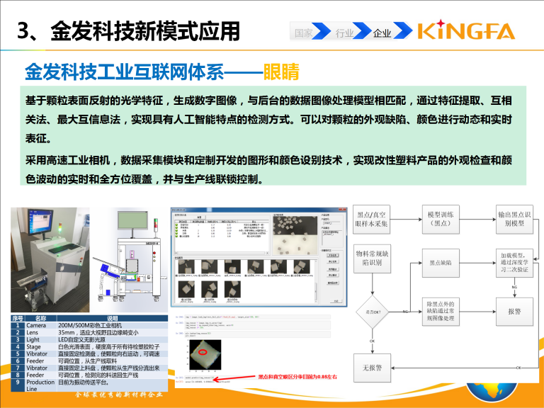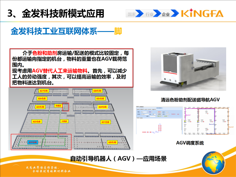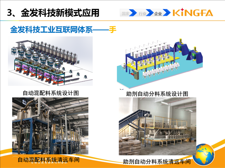 金发科技工业互联网集成建设相关内容包括:信息决策集成系统(MES、ERP、EWM、LIMS、CRM、SRM、PLM等);仿真系统(基于Tecnomatix数字化工厂仿真及挤出过程仿真);工业网络\协议集成(SCADA系统、异构数据集成); 颗粒AOI在线检测系统;自动化设备(自动混配料、自动分料系统、全自动包装码垛系统);智能物流系统(AGV、室外原材料输送系统)